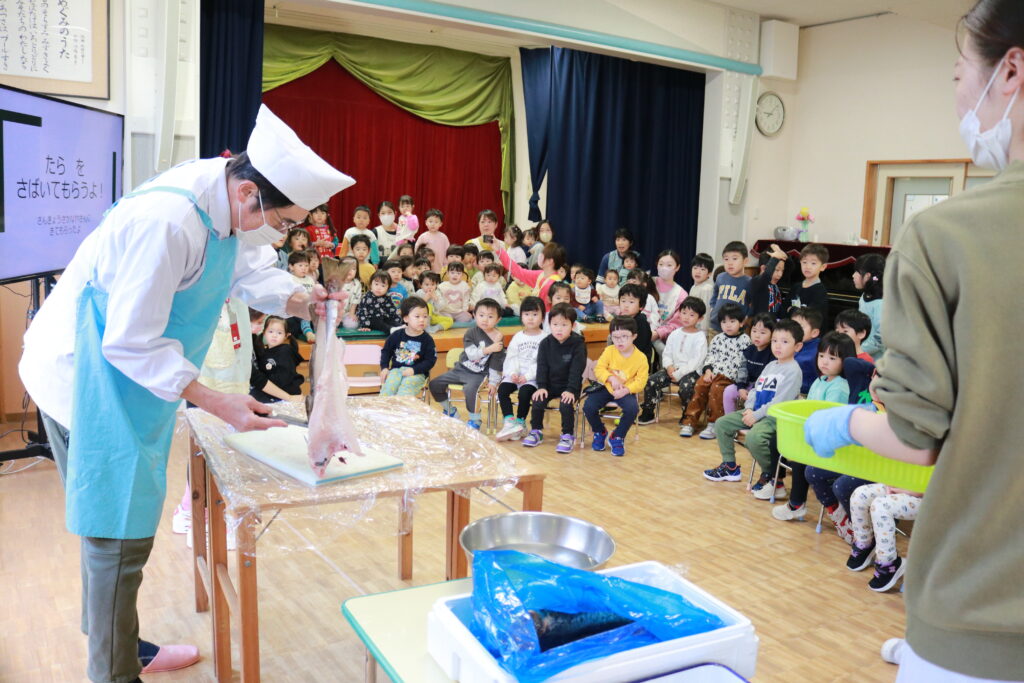 先日、いつも給食用の魚を納品してくださっている「三共魚店」さんが園に来てくださいました。この日は、子どもたちの目の前で、タラを三枚におろす様子を見せていただきま...