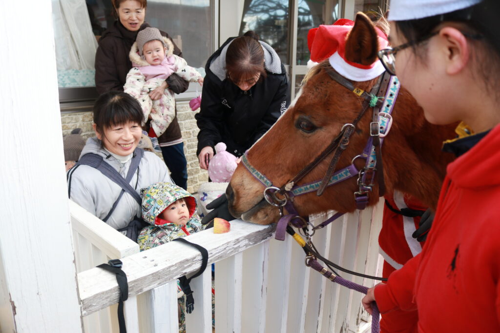 先日、十和田乗馬倶楽部の皆さんが、なんと馬を3頭連れて、サンタさんとして園に遊びに来てくれました。かわいい馬サンタさんの登場に、子どもたちはびっくり!そして大喜...