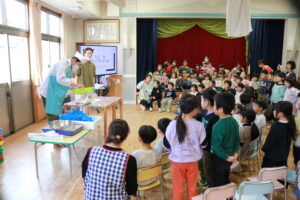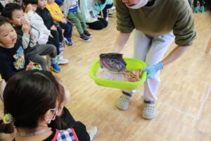 先日、いつも給食用の魚を納品してくださっている「三共魚店」さんが園に来てくださいました。