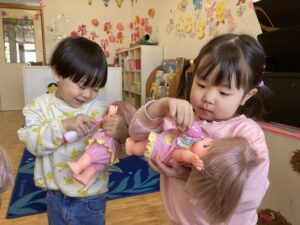 ごっこ遊びの中では、さらに想像の広がりが見られます。「わたしがお母さんね」「ここはお店だよ」と役を決めることで、子どもたちは自分の世界をつくり出します。ときには友達同士でイメージが食い違うこともありますが、そのやりとりがコミュニケーションの力を育みます。
