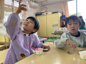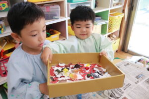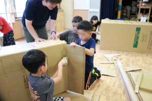とりわけ、うぐいす組(年長)とひばり組(年中)が取り組む「大型製作」は、園を代表する表現活動です。自分たちで「何を作るか」を決め、設計図を描き、協力して組み立て、色を塗り、最後には遊び方を考えてプレゼンテーションをします。完成した後も、自分たちの作品で遊び尽くすことができるのも大型製作の魅力です。作品展に来られる皆さんには、作品そのものの迫力と同時に、そこに至るまでの子どもたちの話し合い、工夫、挑戦、そして遊ぶ姿を想像して楽しんでいただければと思います。